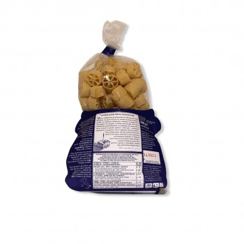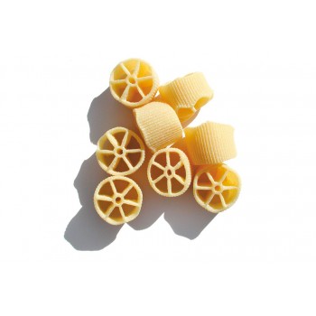 Formato cilindrico alto ca. 22 mm costituito da una corona circolare (Ø 25 mm) collegata al mozzo (Ø 6 mm) da 6 raggi (di 9 mm). Corona, mozzo e raggi hanno 3 spessori differenti che conferiscono alla masticazione quella particolare sensazione paragonabile all’insieme della mollica e della crosta del buon pane; sensazione molto apprezzata dai palati fini. Le “ruote pazze” sono così chiamate nella tradizione salentina perchè non perfettamente circolari. Dopo la cottura, tuttavia, non si schiacciano come accade per i rigatoni e i paccheri ma restano ben tese, consentendo al condimento di penetrare liberamente all’interno e di restarci. Con il metodo di lavorazione “delicato” otteniamo un “tessuto”, così come si vede nella figura, capace di “aprirsi” per un perfetto amalgama con il condimento. Nel nostro stabilimento la trafila delle “ruote pazze” è presente già in un inventario datato 1938. Le “ruote pazze” sin dall’origine hanno avuto un successo, mai interrotto, in Italia e all’estero e sono presenti nei menù di molti ristoranti anche tra i più blasonati del mondo.